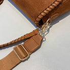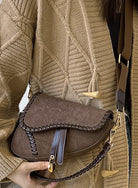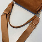 Vegan suede saddle purse with braided boarder details.