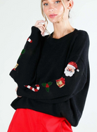Get in the festive spirit with this holiday sweater featuring a ribbed crew neckline, slight dropped shoulder, and playful sequin designs of Santa and gifts as well as embroidered holly and candy cane accents down the arm. The details in this super soft sweater will surely spread some holiday cheer!