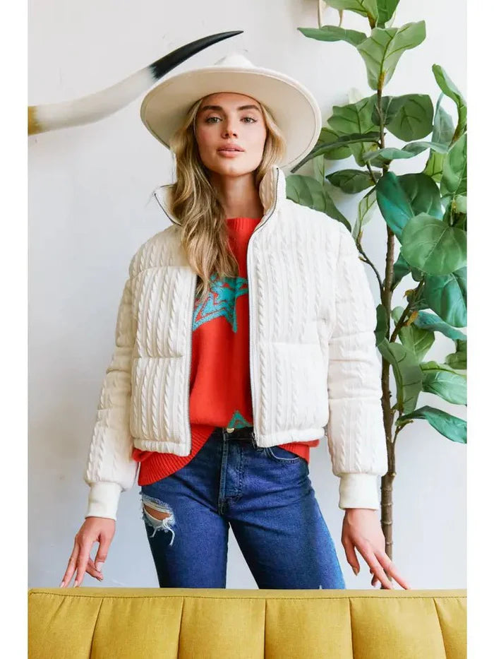 Look luxe and feel cozy in this ivory Cable Knit Puffer Jacket. Its classic cable knitted texture adds a hint of texture to your look, while its perfect neutral ivory color ensures you're stylish, not too matchy-matchy! And you'll stay warm and toasty on those chilly days and nights with its great insulated weight. Snuggle up!