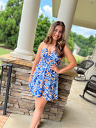 Gorgeous tropical print dress with halter neckline.  Beautiful shades of blue & orange.  Great for your next vacay, brunch or just a day out on the town.