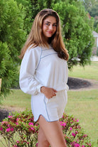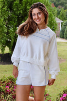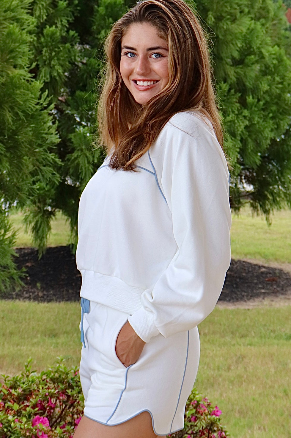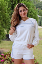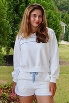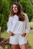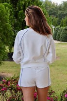 The "Lyla" Piped Lounge Set combines a white short and sweatshirt, highlighted with elegant light blue piping. Crafted from soft, cozy fabric, this set is perfect for relaxing at home, running errands, or enjoying a lazy Sunday, offering a sophisticated option you’ll want to wear again and again. From one of our favorite vendors "Papermoon"