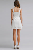 Fit: Slim fit through the bodice with a slight A-line mini skirt and smocked back.